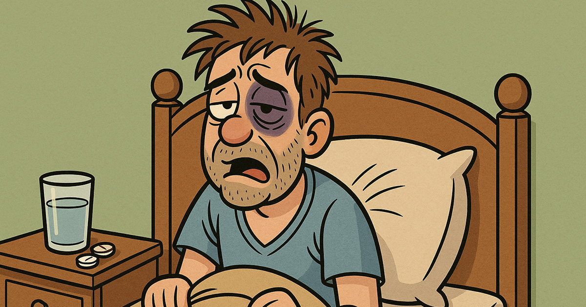 Han satte seg opp og oppdaget til sin overraskelse at alle klærne hans var rene og strøkne. Han slukte tablettene og gikk på toalettet. Men da han så seg i speilet, oppdaget han at han hadde et blått øye – og nå begynte angsten virkelig å komme.