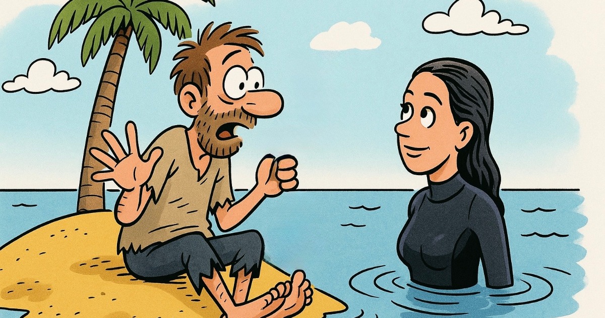 En mann blir strandet på en øde øy. Etter 14 år uten kontakt med andre mennesker, ser han plutselig en dag noe i horisonten.