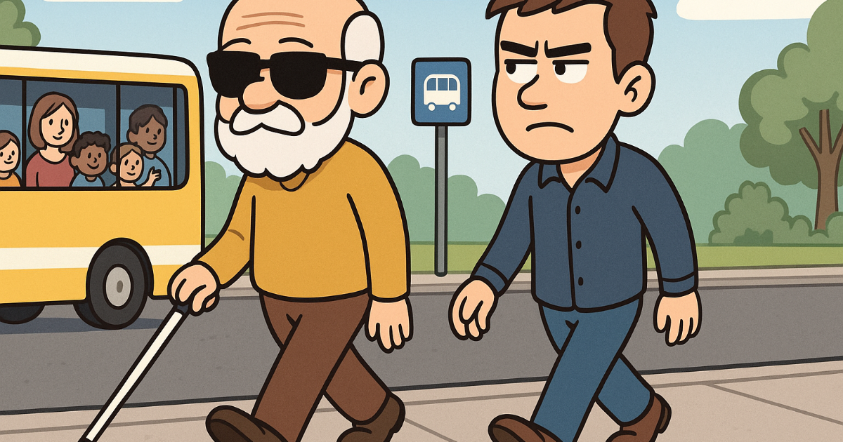 En mann og hans kone venter på bussen på bussholdeplassen sammen med deres ni barn. En blind mann stopper opp på bussholdeplassen ved dem.