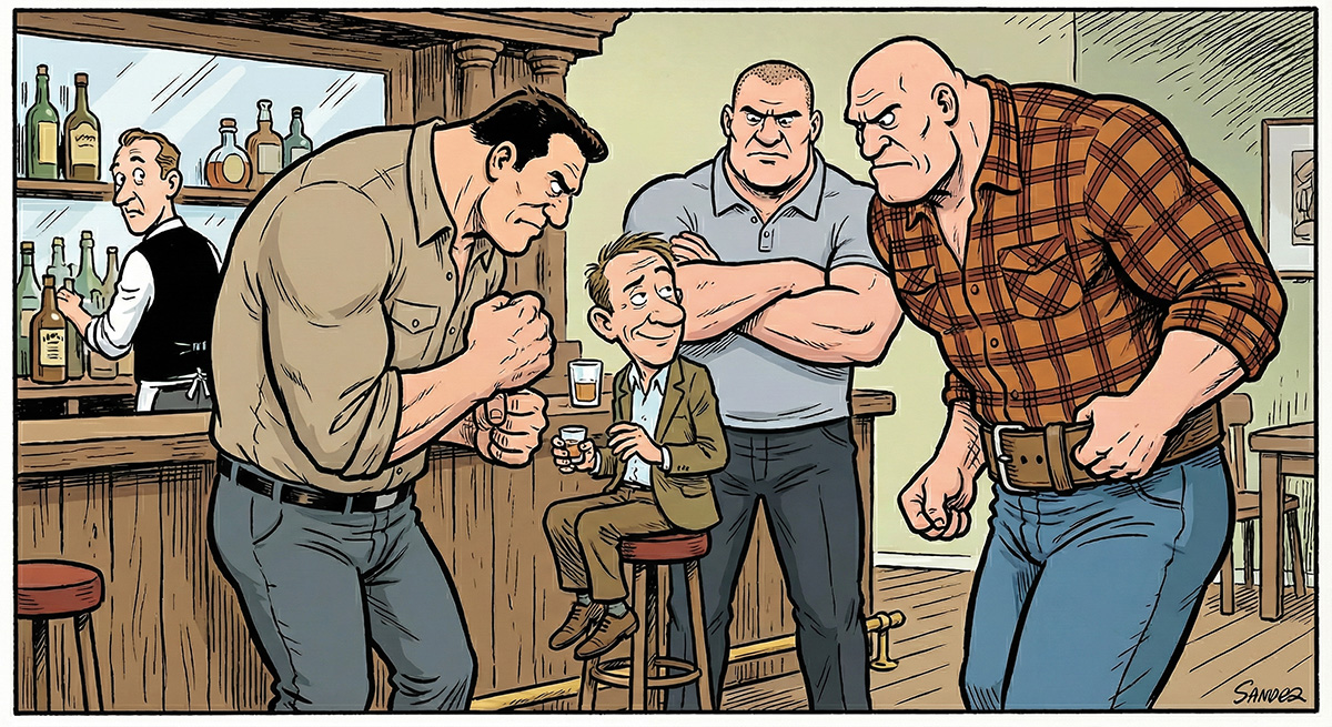 Den kraftige mannen snudde seg og svarte: «Vel, kamerat, før du forteller den vitsen, bør du vite et par ting: