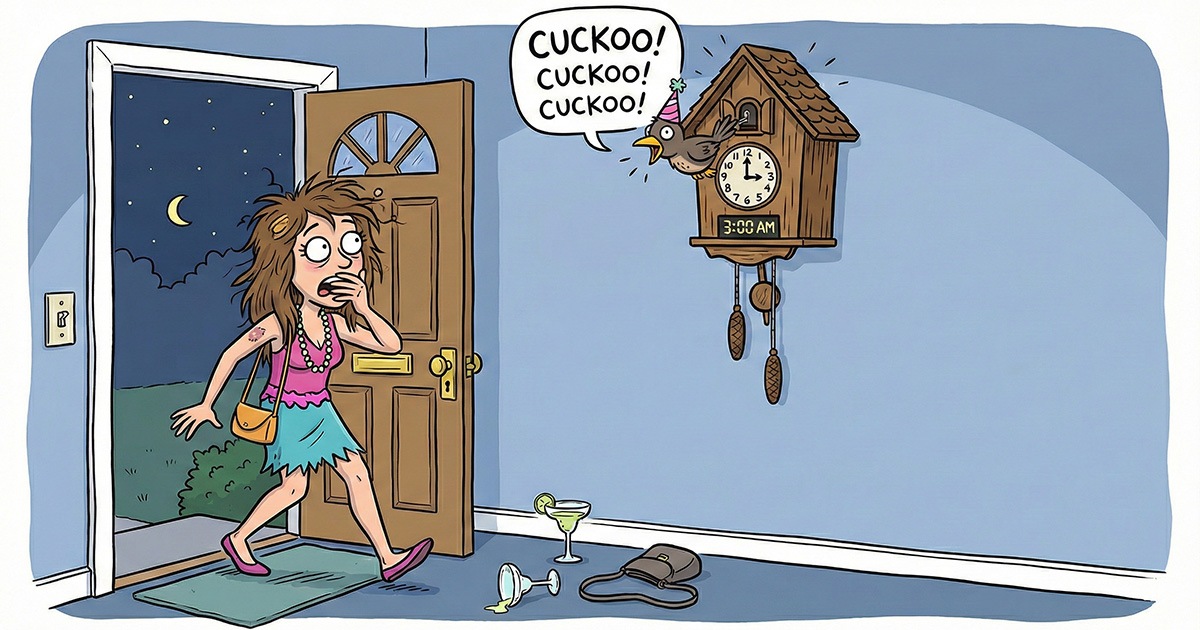 Akkurat da jeg kom inn gjennom ytterdøren, satte gjøkuret i gangen i gang med å gale 3 ganger. Lynraskt, da jeg innså at samboeren min sannsynligvis ville våkne, gol jeg 9 ganger til.