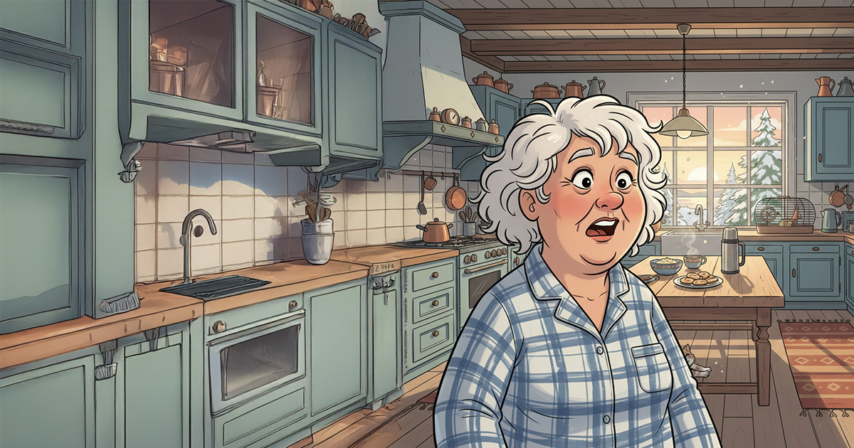 I det samme kom kona løpende inn på kjøkkenet, vekket av det voldsomme skriket. Hun ble stående målløs og stirre på mannen som sto der naken med sine edle deler i bollen.