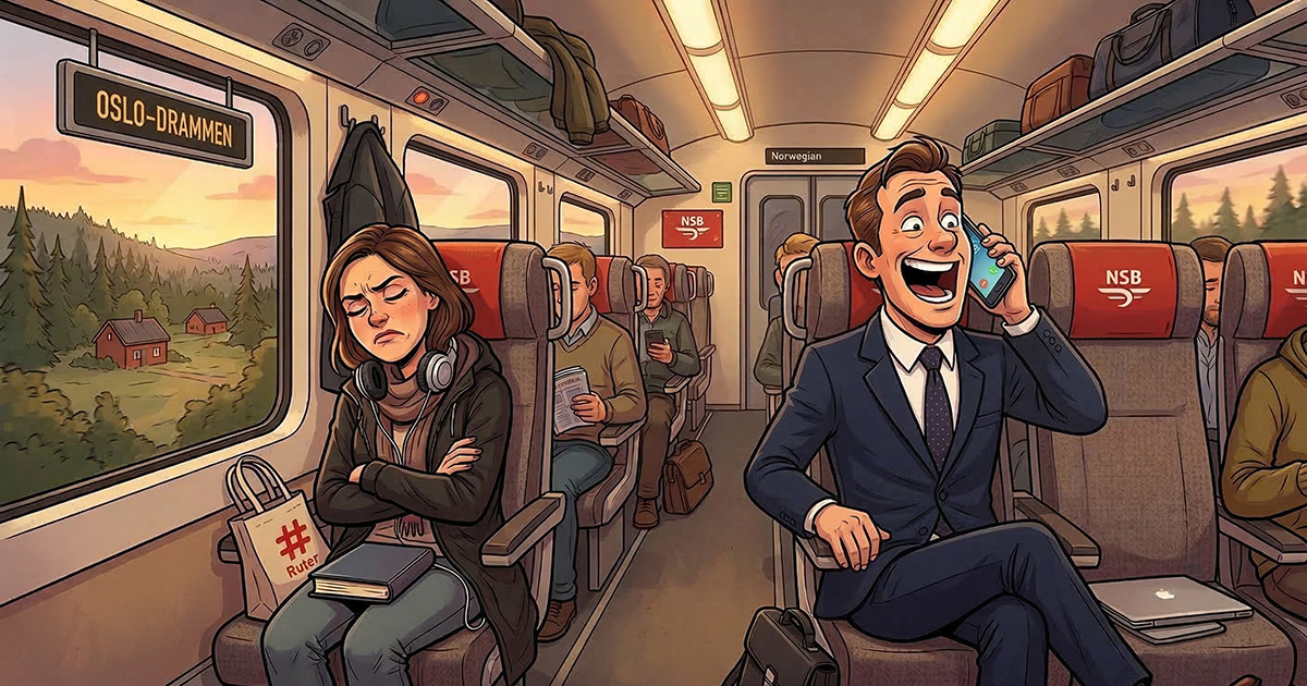 Etter en lang arbeidsdag synker Maria ned i togsetet og lukker øynene for å få litt fred. Idet toget ruller ut fra stasjonen, drar Preben i nabosetet frem mobilen og begynner å snakke med rungende røst: