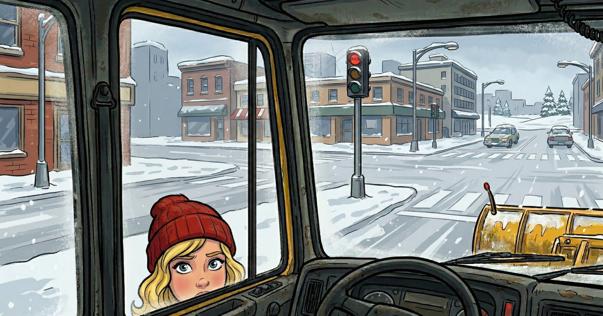 Trafikklyset skiftet til grønt og sjåføren kjørte videre uten å bry seg om advarselen. Den lille blondinen løp inn i sin røde Mercedes og kjørte etter. Ved neste røde lys måtte lastebilen stoppe igjen, og Mercedesen kjørte opp ved siden av ham. Ut kom blondinen, løp fram til døren hans, banket på og han åpnet: