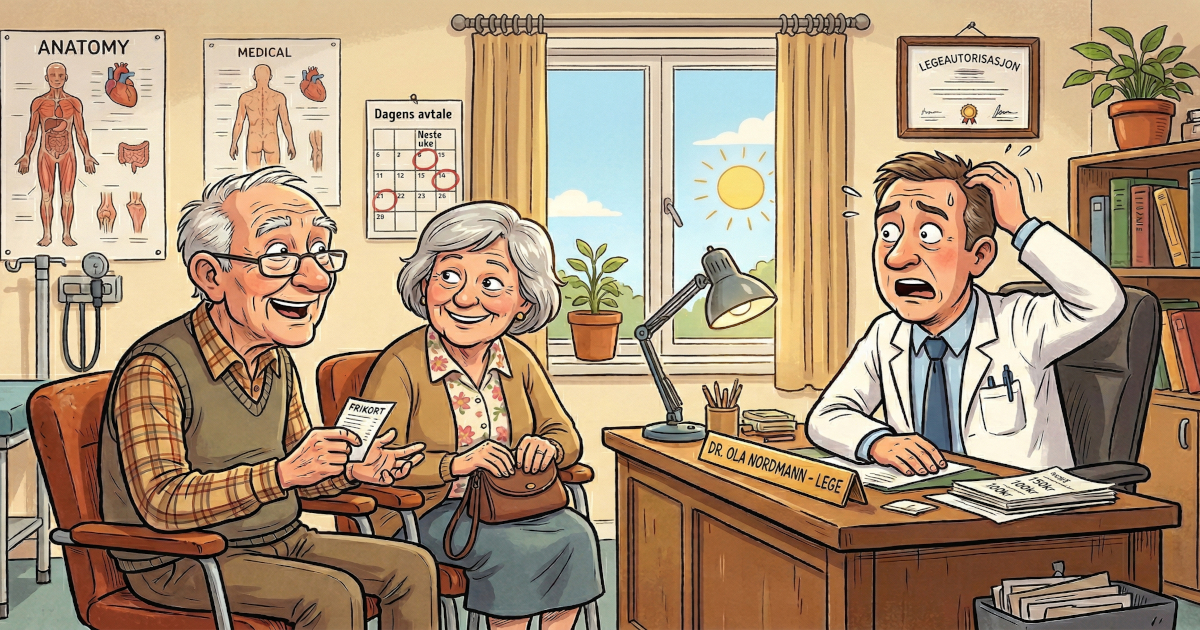 Et eldre par besøker legen. Legen lurer på hvordan han kan hjelpe dem. Mannen svarer: – Kan du se på mens vi elsker?