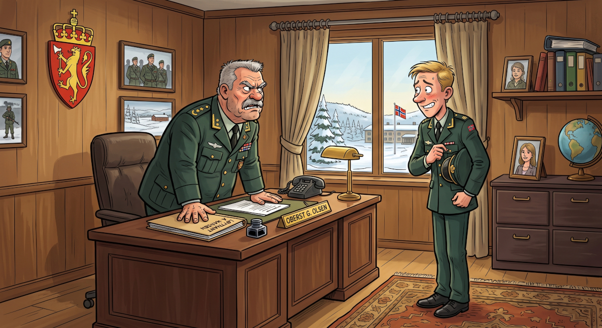 Løytnanten: – Ehm… ja, det stemmer nok også, hr. oberst. Et trengende naturbehov, jeg beklager dypt.
